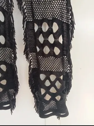 Elegante chal negro con un diseño triangular y adornado con flecos. - Material suave y ligero. - Flecos largos y abundantes. - Borde con detalle de crochet.