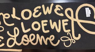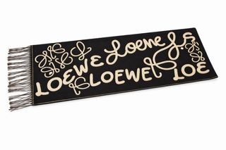 Bufanda de la marca Loewe con un diseño de logo repetido. - Color negro con detalles en beige. - Acabado con flecos en los extremos.