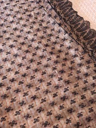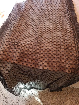 Elegante mantilla antigua con un delicado diseño de encaje. - Color negro. - Patrón de pequeñas flores. - Borde con volantes.medidas 174x73 cm