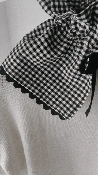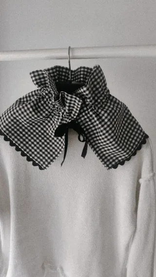 Cuello decorativo con un diseño a cuadros en blanco y negro, con un detalle de volantes y lazos. - Diseño a cuadros. - Volantes. - Lazos negros. - Borde festoneado.