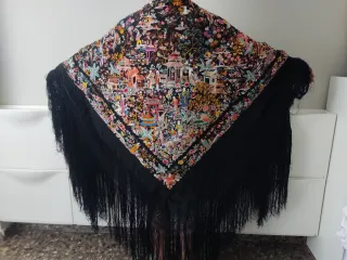 Elegante mantón de Manila vintage, una pieza artesanal de seda negra con preciosos bordados. Diseño tradicional cantonés. Motivos florales y paisajísticos. En perfecto estado, sin uso. 155 cms + 55 cms de enrejado. Pesa dos kilos. espejo murano bambú mantilla porcelana plata contrastada Siam arquitecto tipo ratán modernista duralex benditera table ware bordado a mano lámpara opalina espejo artdeco forja terraza industrial étnico Tupperware broche colección flexo sol luna mandala amuleto china cloisonné vainica belen bronce retro tarot firmado mueble Japan buda artnouveau 13 gafas mazzega desing numerado rare el casco en