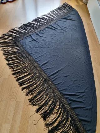 Elegante mantón de color negro, con un bonito detalle de flecos largos. - Diseño triangular. - Adornado con una banda de encaje. - Flecos negros en todo el borde. #manton #mantonflecos