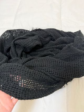 Prenda de ropa con un diseño de malla abierto y un acabado deshilachado en los bordes. - Material de malla. - Color negro. Ideal para frio ya que protege bastante, es largo y redondo para darle vueltas y tener varios pliegues