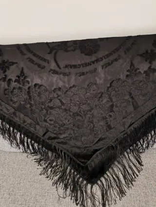 Elegante mantón negro con un diseño floral en relieve y adornado con flecos. - Diseño floral en relieve. - Flecos en todo el borde. Mantón flecos baturra, sevillana