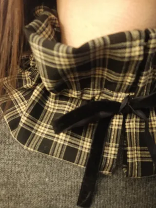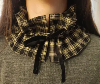 Cuello de tela hecho a mano con un diseño a cuadros. - Cierre con lazo de terciopelo negro. - Fruncido.