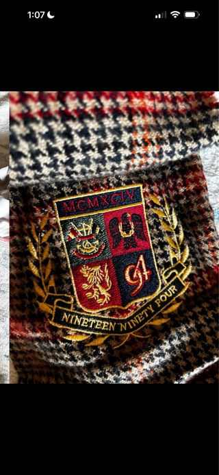 Bufanda de lana con un diseño de pata de gallo y un escudo bordado. - Diseño de pata de gallo en multicolor y rojo. - Escudo central con MCMXCIV y NINETEEN NINETY FOUR bordados. - Detalle de laureles dorados rodeando el escudo.