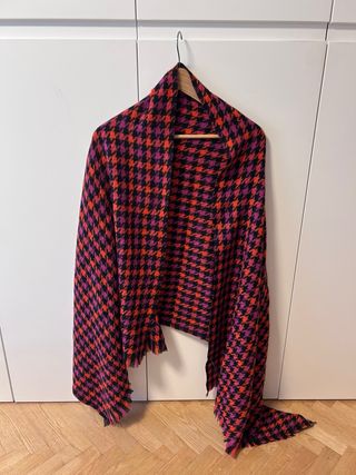 Bufanda chal con un alegre estampado. - Diseño de pata de gallo. - Tonos morados y naranjas vibrantes. - Acabado con flecos.