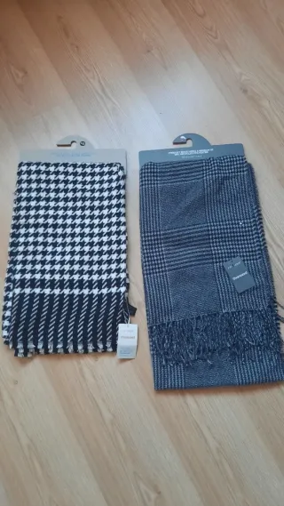 Dos bufandas de la marca Primark, nuevas y con etiqueta. - Diseño de pata de gallo en blanco y negro. - Diseño de cuadros en gris y negro. Miden 196 cm por 90. De venta en Valdemoro - Ambas con flecos decorativos.
