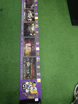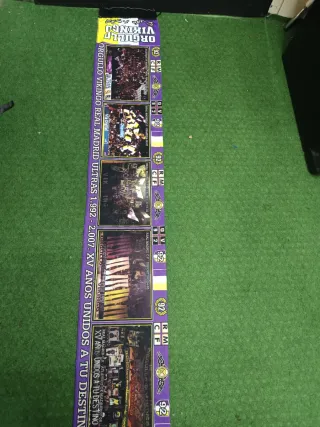 Bufanda conmemorativa del Real Madrid. - Diseño Orgullo Vikingo. - Representa los años 1992-2007. - Incluye imágenes de partidos y aficionados. - Colores morado y multicolor.