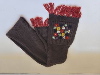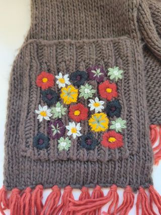 Bufanda de punto grueso en color marrón chocolate, con bordado artesanal de flores multicolor en uno de los extremos y flecos en tono caldera. Diseño muy cálido, con textura suave y estilo boho. 📦 Características: Material: 100% acrílico (suave y muy agradable) Bordado frontal con flores en tonos rojo, amarillo, blanco, verde y berenjena Flecos gruesos en color caldera Tejido de punto ancho, cálido y flexible Talla: U (única) Marca: MNG Accessories 🧵 Estado: Muy buen estado general. Sin bolas visibles, tejido cuidado y flecos completos. 📏 Medidas aproximadas: Largo unos 170 cm aprox #bufanda #bufandatejida #bufandadepunto #m