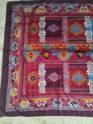 Pañuelo vintage con un diseño inspirado en los kilims. - Estampado geométrico en tonos burdeos, rojos, azules y amarillos. - Borde decorativo. - Tacto suave y sedoso.