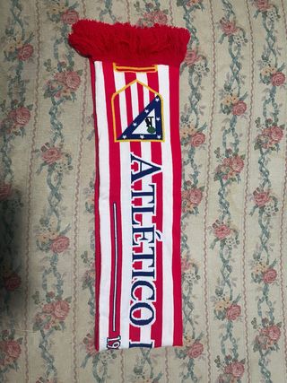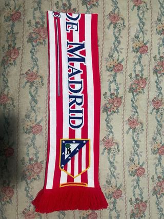 Bufanda del Atlético de Madrid con diseño a rayas rojas y blancas. - Detalle del escudo del club. - Flecos rojos en los extremos. - Texto ATLÉTICO DE MADRID bordado en azul y en blanco en la parte trasera