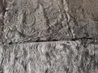 Elegante mantilla de encaje con un intrincado diseño floral. La parte inferior presenta una delicada caída de flecos de seda - Diseño floral detallado. - Flecos decorativos en el borde. - Comprada en Sevilla