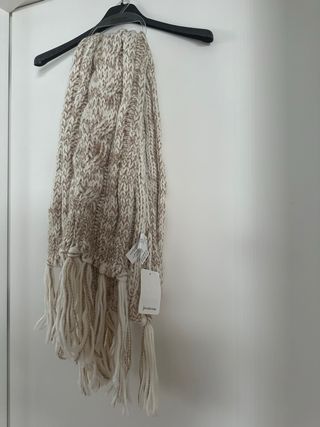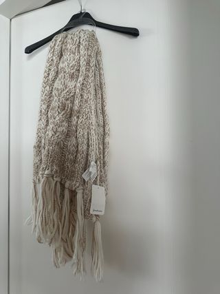 Bufanda de Stradivarius en tonos beige y blanco, con un diseño elegante y moderno. Está en perfecto estado, prácticamente nueva. - Tejido suave y ligero. - Detalle de flecos en el bajo.