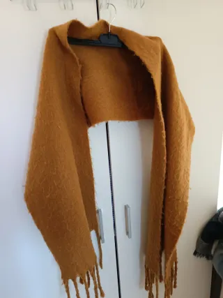 Bufanda de tacto suave y cálido, con un diseño de flecos en los extremos. - Material: Lana. - Color: Marrón. - Flecos decorativos. Sin usar, en perfectas condiciones 😊