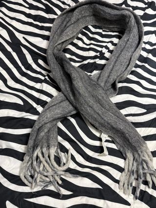 Bufanda maxi de lana con flecos, muy suave y cálida. Color gris oscuro. Perfecta para los días fríos. Medidas 210 cm de largo incluyendo los flecos, y 40 cm de ancho. Nueva, sin uso. - Diseño largo y envolvente. - Acabado con flecos.