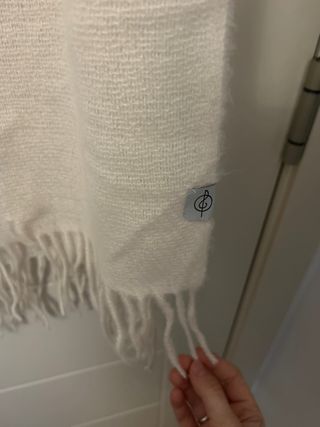 Bufanda larga de Stradivarius en color blanco. Es suave y cálida, con un diseño moderno. - Tejido muy suave y agradable al tacto. - Diseño con flecos en los extremos. - Detalle de un pequeño botón decorativo de Stradivarius. - Talla M. Nueva, nunca usada.