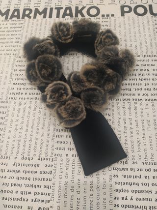 Bufanda, cuello de Taha, color negro 100% poliéster, tacto de terciopelo y piel de conejo Rex con forma de flor, 100% piel. 70 cm de largo. Nunca usada.