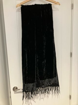 Pashmina negra, nueva sin etiquetas. Tacto terciopelo en el exterior, en los extremos tira de lentejuelas cuadradas y flecos. Interior tela negra de algodón. Medidas aproximadas: 172 cm largo por 46 cm ancho.