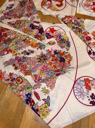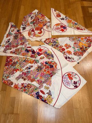 Conjunto de cinco pañuelos con un vibrante diseño floral. Presentan desteñidos, ver fotos. - Cada pañuelo presenta un estampado único y colorido. - El material es seda según etiqueta de composicion . aportando un tacto suave y elegante. - Ideales como accesorio de moda o para coleccionistas.