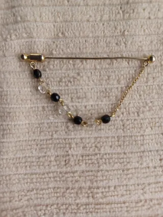 Precioso alfiler de corbata (o solapa) antiguo, estilo mid-century. Una pieza elegante y original para coleccionistas o amantes de la moda retro. Diseño: Barra dorada con cadena de seguridad ornamentada con cuentas de cristal facetado en color negro y transparente. Estado: Muy buen estado de conservación. El baño dorado mantiene su brillo y las cuentas están intactas. Seguridad: Incluye su terminal/tapón de cierre original para evitar pérdidas y proteger la ropa. Medidas: Aprox. 6 cm de largo (ver fotos con metro). Estilo: Perfecto para eventos, bodas o para dar un toque distinguido a una americana o bufanda. Etiquetas: #Vinta