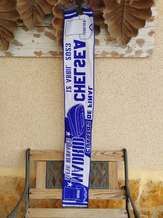Bufanda del Chelsea FC conmemorativa del partido contra el Real Madrid en el Bernabéu en 2023. - Diseño con los escudos de ambos equipos. - Fecha del partido: 12 de abril de 2023. - Cuartos de final y Nuevo Bernabéu impresos.
