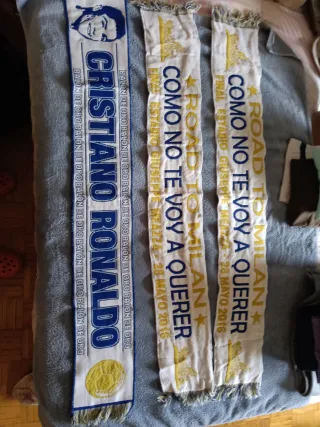Conjunto de tres bufandas de Cristiano Ronaldo. Dos de ellas son iguales y hacen referencia a la final de la Champions League en Milán. - Bufanda con imagen de Cristiano Ronaldo y Balón de Oro. - Dos bufandas con Road to Milan y Como no te voy a querer. - Referencia a la final del estadio Giuseppe Meazza del 28 de mayo de 2016.
