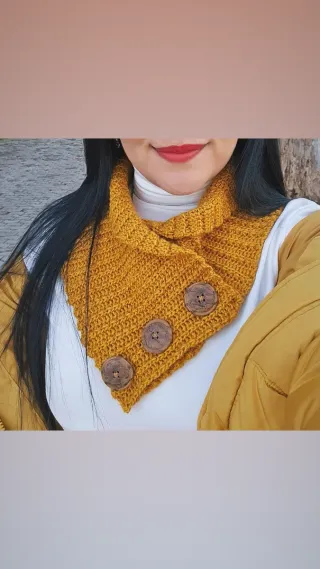Cuello bufanda tejido a mano con un diseño moderno y abrigador. Ideal para complementar tu atuendo. - Tejido a crochet. - Con tres botones de madera. - Diseño asimétrico.