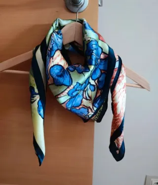 Pañuelo 100% seda, con estampado del cuadro "Lirios" de Van Gogh. Muy favorecedor, combinable con todo tipo de prendas, así como para llevar a modo de cinturón, de adorno en el bolso, etc. Medidas: 84 x 84 cm. Está sin estrenar. ~ pañuelo fular foulard bufanda abrigo cazadora chaqueta blazer traje