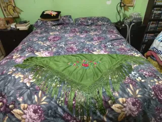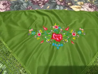 Elegante mantón de color verde con un delicado bordado floral en tonos rojos y rosas. Presenta un fleco largo que le da un toque especial, está nuevo - Diseño triangular. - Bordado floral detallado. - Flecos largos y abundantes.