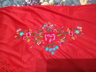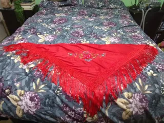 Elegante mantón de color rojo, adornado con un bonito bordado floral multicolor en el centro. Los bordes están rematados con una franja de flecos largos y vistosos, está nuevo - Diseño triangular. - Flecos rojos. - Flores bordadas en tonos vivos.