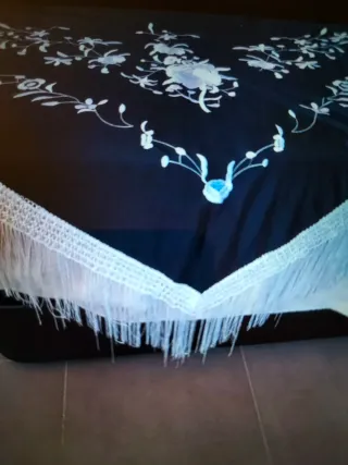 Elegante mantón negro con un delicado bordado blanco y flecos. - Diseño floral bordado. - Adornado con flecos blancos. - Borde de encaje.