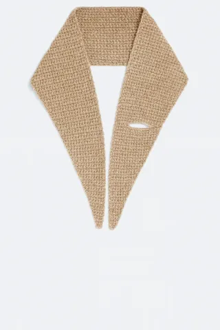 Pañoleta tejida a mano con lana de alta calidad. Su diseño triangular y el detalle de ojal la hacen única. - Material: Lana. - Color: Beige y marrón.