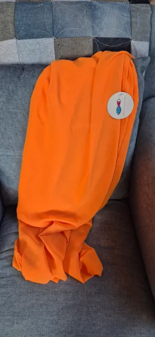 Precioso chal o pañuelo grande de tela ligera. Tiene una abertura en el centro para pasar por la cabeza si se desea. Con etiqueta por lo que puede ser un regalo o detalle. - Color naranja - Tacto suave y fluido. - Ideal para complementar cualquier atuendo, completamente vestido fiesta, etc
