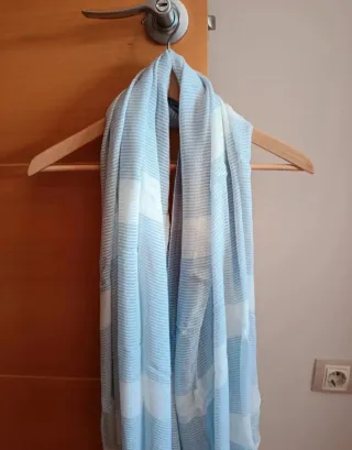 Bufanda trenzada, de estilo oversize, azul terminada en flecos. Muy agradable, calentita y combinable con todo tipo de abrigos y cazadoras. Tiene la etiqueta interior cortada y un pequeño hilo saltado (ver fotos) pero por lo general, está en perfecto estado.
