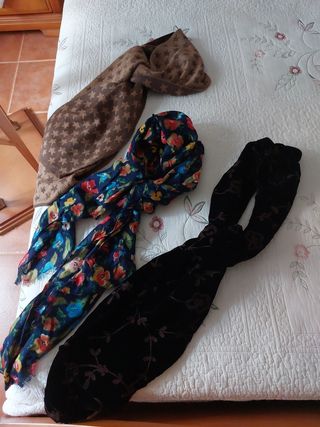 3 panuelos diferentes para cada ocasion: - Terciopelo para lucirlo en ocasiones elevarà tu look. - Floral, más finito para primavera y otoño. - Estrellado reversible para lucirlo con abrigo camel, por ejemplo queda ideal El precio es por cada uno. Los 3 son 6 euros