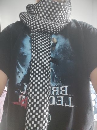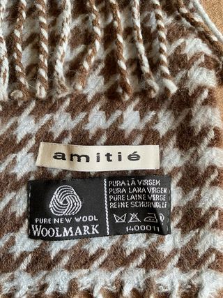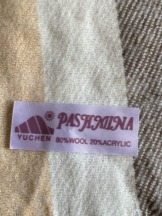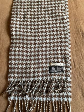Bufanda con tacto suave, es de cuadrados negros y blancos, parece de lana, aunque no lleva etiqueta, es calentita. La he usado un par de veces.