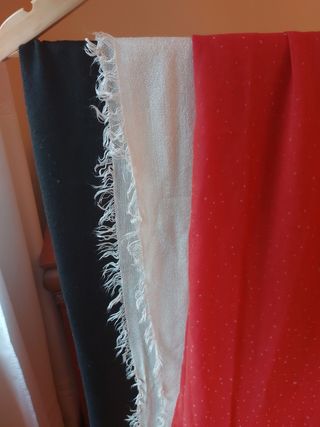 1 Negro liso de Zara 1 Coral con topitos crudos de Amichi 1 Crudo local Aprox de 1,15 por 2 m, aunque el crudo es un poco más pequeño 4 euros cada uno el lote 10 euros