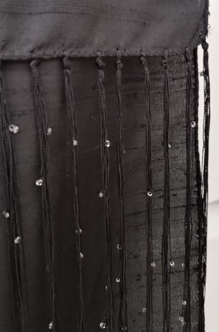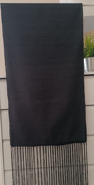 Precioso chal de seda en color negro de Tintoretto. Es seda 100%, con pedrería en los flecos. Ideal para cualquier evento. Está impecable, solo usado en una ocasión. Tengo más chales en mi armario.