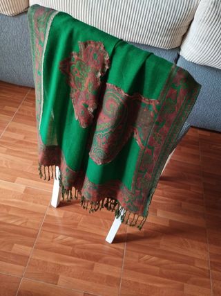 Pashmina con diseño de cuadros en tonos verdes y rojos. Presenta flecos en los extremos. - Diseño a cuadros. - Flecos decorativos.