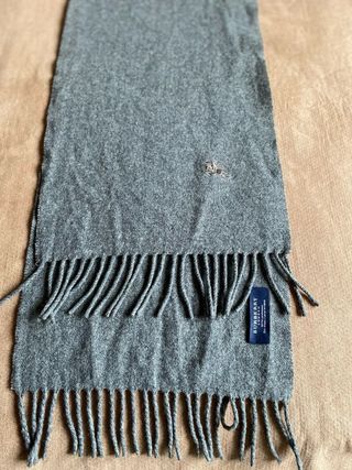 Bufanda de lana de cordero de Burberry en color gris. Presenta el icónico logo del caballero ecuestre bordado. - Material: 100% Lambswool. - Diseño con flecos en los extremos. - Etiqueta de cuidados incluida. 🔅152cm.x 27cm.