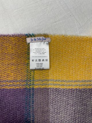 Bufanda grande con un diseño de cuadros llamativo. Tamaño 1,80 cm largo x 0,70 cm ancho - Tejido suave y cálido. - Diseño a cuadros en tonos morados y amarillos.