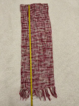 Nueva, la etiqueta la corté para guardarla y jamás la he usado. Muy suave, en tonos rosa maquillaje con hilos enlazados blancos o crudos. Muy abrigada, da para dos vueltas sin apretar.