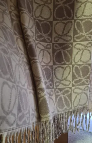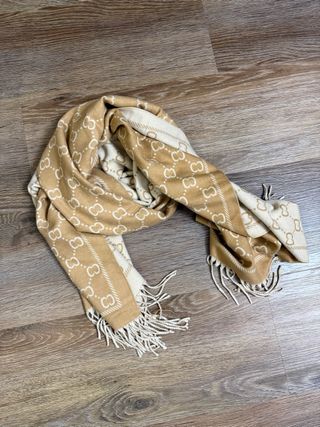 Bufanda elegante con un diseño distintivo. - Patrón de monograma. - Flecos en los extremos. - Tejido suave y cálido.