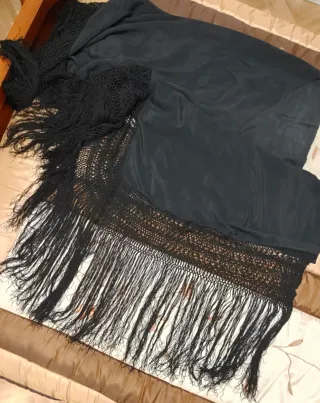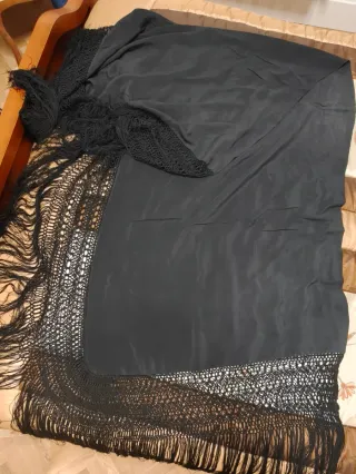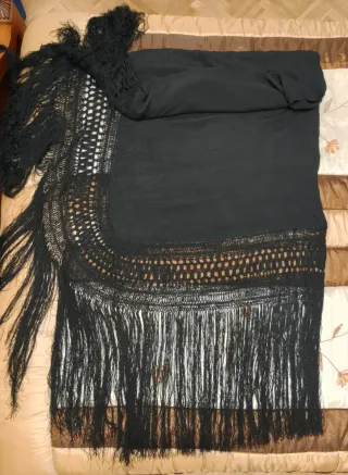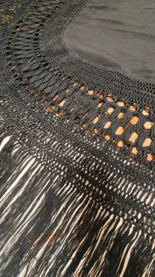 Elegante mantón de Manila de color negro, con un diseño clásico y detalles de flecos. - Elaborado con tejido de seda. - Adornado con un intrincado encaje. - Amplios flecos que aportan movimiento y sofisticación. - Antiguo y original Base 150x132cm Flecos 30cm Enrejado 16cm Peso 500gr