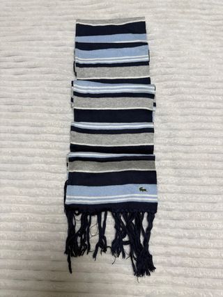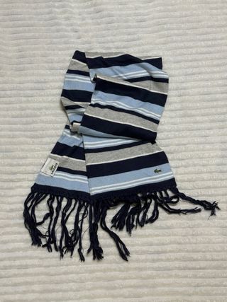 Bufanda de punto con diseño de rayas horizontales. - Diseño a rayas en tonos azul, gris y blanco. - Detalle de flecos en los extremos. - Pequeño logo de Lacoste bordado.