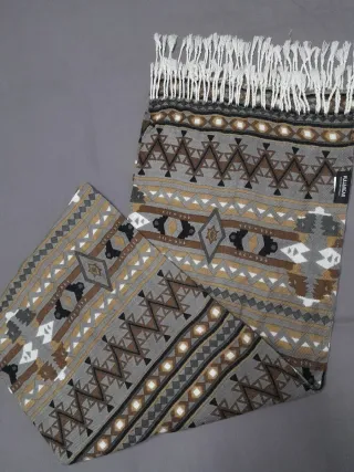 Bufanda con un diseño geométrico y flecos. - Estampado étnico en tonos grises, marrones y ocres. - Flecos blancos en los extremos.