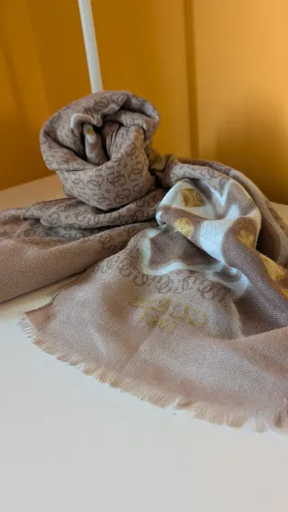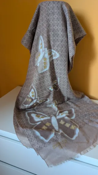 Preciosa bufanda Guess de color marrón beige. Es suave y tiene un diseño elegante con mariposas doradas. Perfecta para añadir un toque de estilo a tu look. - Diseño con el logo de Guess. - Dos mariposas doradas en relieve. - Tejido suave y ligero. Es de segunda mano, pero está impecable. No envío