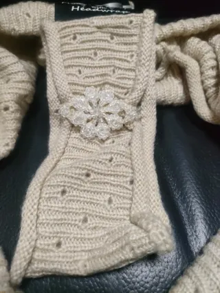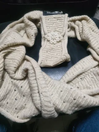 Conjunto de bufanda y cinta para el pelo a juego, ambas tejidas con un diseño delicado. - Bufanda tejida con puntos calados. - Cinta para el pelo con detalle de flor de pedrería. - Tejido suave y cálido.