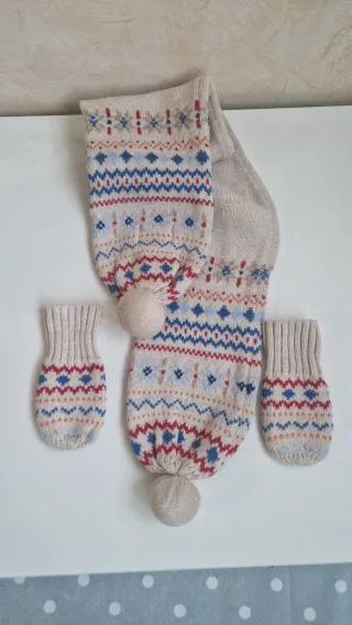 Conjunto muy bonito de bufanda y manoplas de punto con diseño jacquard.Bufanda con pompones. Manoplas a juego.Como nuevo, sin las etiquetas.Talla 6 meses,pero la bufanda da para más edad.Más artículos infantiles en mi perfil. Entrego en mano en Alcorcón o envío por la aplicación.